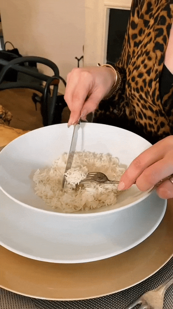 如果用其他食物搭配米饭时,也建议把其他食物和米饭一起推到叉子上,“这样吃起来会更加方便”。